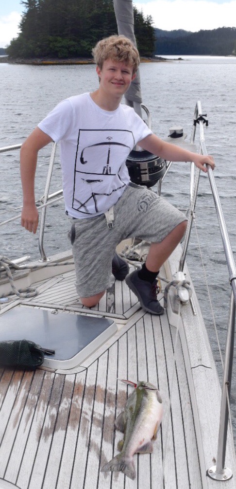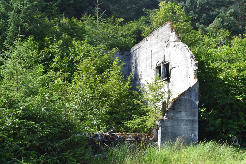 ready to head up the creeks to spawn… they must have arrived in great shoals overnight, the waters around us were saturated with the colourful streaks of countless fish. It was too good an opportunity to miss. We soon had our rod and line out – within minutes Henry hooked our first coho salmon of the summer and all thoughts of the mysterious mine half way up the mountainside were forgotten as we hauled aboard Henry’s huge salmon with our landing net. Marie told us we had more than enough with the one we’d already caught, that we didn’t need to catch any more. Of course Marie would gut and fillet the salmon but there was only so much fresh salmon we could consume or ever store onboard. Whilst Henry eagerly posed for pictures of his proud catch with his beaming mother standing by his side my eye quickly caught a movement ashore, for a fleeting moment I thought I saw someone standing beside the half collapsed building to the left of the wharf, but when I looked more closely there was no one there.