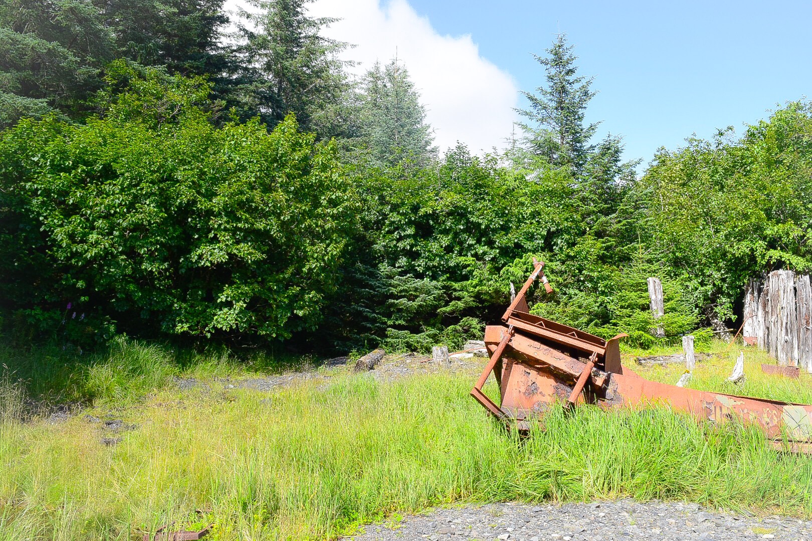 This was an amazing place. There was old machinery and bits of brown rusted processing plant everywhere, with the remains of three or four buildings which stood half-collapsed and overgrown by the dense tree line that crept relentlessly towards the shore. We poked around for a good hour trying to