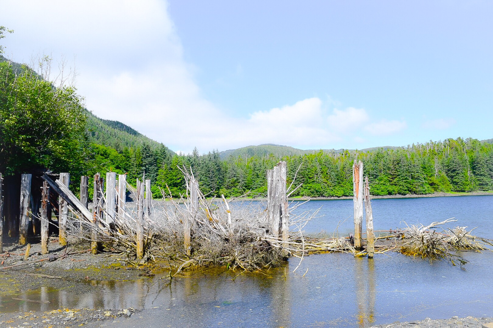 find the trail up to the mine itself, which we’d been told was hard to locate though there was supposedly an old roadway that wound its way up the mountainside to the mine entrance itself. They’d said in both Elfin Cove and Hoonah the mine was still accessible if possessing nerves of steel to go inside. We’d also been warned that grizzlies probably used the mine itself as a den… we were also conscious that it was on the trail to the mine that the guided group the year before had been attacked, so we were rightly concerned and understandably wary – there was plenty of bear shit and fish heads around… sure signs that grizzlies prowled around here relatively unmolested. Then Henry found what he thought might be the trail.
