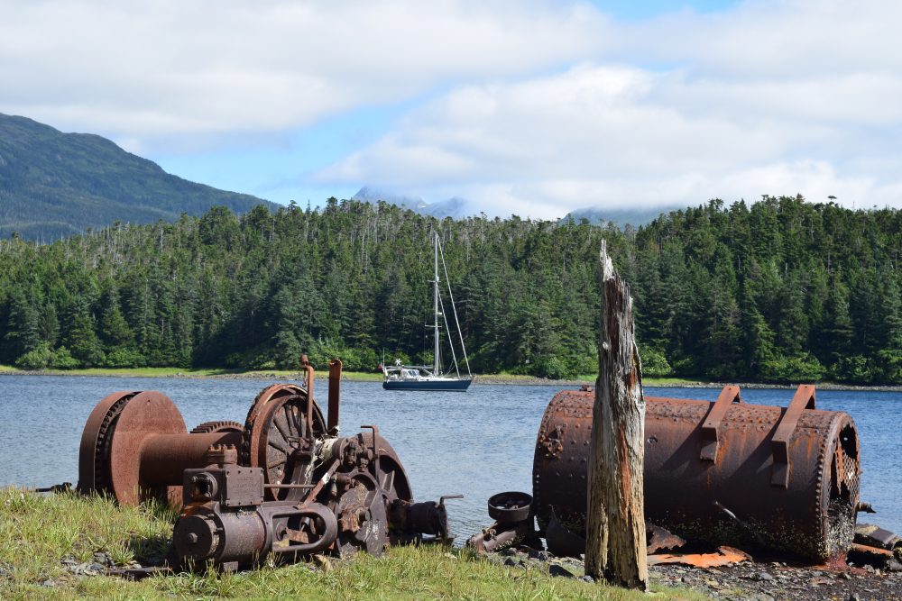We had a specific destination in mind. From Elfin Cove we slowly meandered southeast in sublime westerly winds before turning easterly towards the ruins of the abandoned Chichagof Gold Mine. We’d often heard whispered rumours about the mine, how difficult it was to find and then reach although we’d been given detailed instructions by the fishermen in Elfin Cove on how to get there. First, despite the official line, they told us the mine did indeed exist and how we should locate