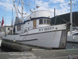 Moored right next to Sänna here in Hoonah is Icy Queen, a wily forty five year old Seine fishing trawler. At first call I could see the roughneck crew weren’t much interested in the likes of us… sort of retired, snobby English who’d sailed their fancy sailing boat all the way. But we and them would sometimes nod our good mornings whenever our eyes met… these no nonsense, hard working, proud men who grind their lives from the sea.