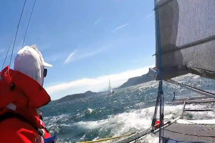 Then suddenly, as if by some strange event, when I turned to make the approach into the Narrows we were out of the blue joined by a large pod of magnificent orca whales. They began to toy and spin around Sänna inside the waves and fast flowing whirlpool currents before leaping ahead of our bows as if surely offering to lead us safely through. These wonderfully intelligent creatures provided an unbelievable spectacle which in these horrible conditions was a welcome respite – the rain now beat down incessantly with the wind gusting well over thirty knots astern. I was effectively sailing solo because there was little Louise and Sarah could do to help although Louise stood relentlessly by my side, she brewed hot tea and had no problems doing everything I asked regardless of the dangerous conditions we now faced.