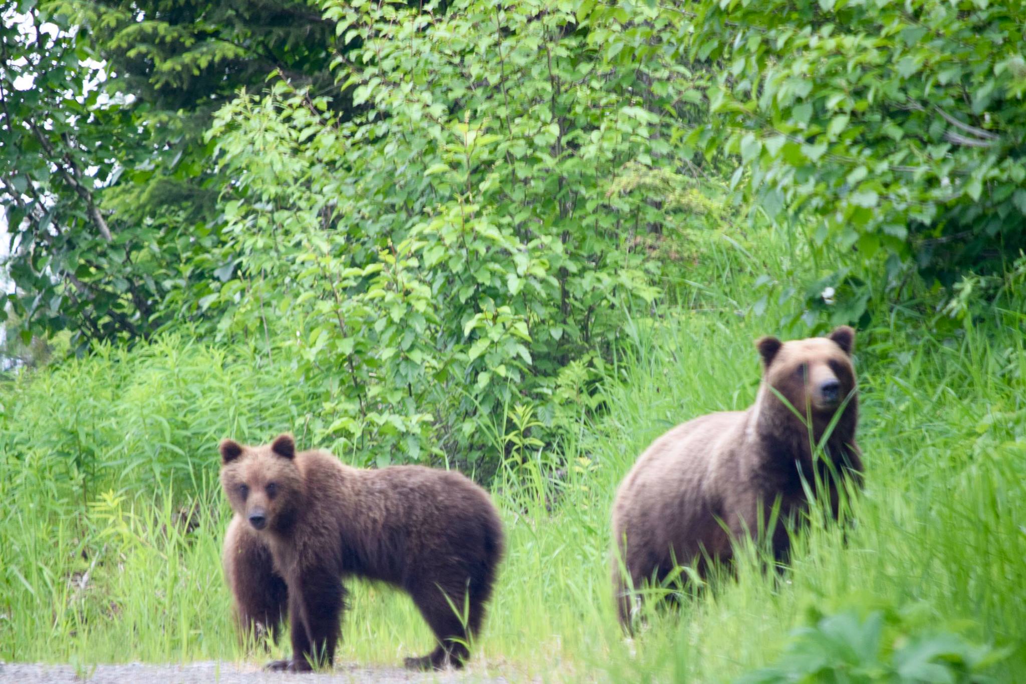 Louise Ungless - Kennel Creek CabinThe next morning I talked with Ed down at the Icy Straits Lodge about loaning his four wheel drive. There are no roads on Chichagof Island, just overgrown logging tracks accessible only by rugged all-terrain vehicles. Ed agreed, so Louise and I together with Leighton and Lynda drove off into the wild interior of the island to go bear hunting… though not in the strictest sense, we were armed only with cameras, a feeling of determined adventure and a picnic lunch… we were not even outside the Hoonah boundary line before we encountered our first large male grizzly meandering down the last bit of paved roadway – Chichagof Island has the largest concentration of grizzly bears in the world. We headed out of town towards Freshwater Bay, finding the remote Kennel Creek cabin there which was, of course, the perfect location to consume lunch with our delicious feed of Costco’s version of world cheeses, with home-baked sourdough bread and raw smoked king salmon courtesy of our fishermen friends onboard Yankee Maid. The long relentless drive back to town proved to be a real bonus… we tracked a female brown bear with her two full-grown cubs for over an hour, getting really good close up photos. Louise was in her unbounded elements with her new SLR camera now retrofitted with my own long-range lens that ‘just happened’ to fit.