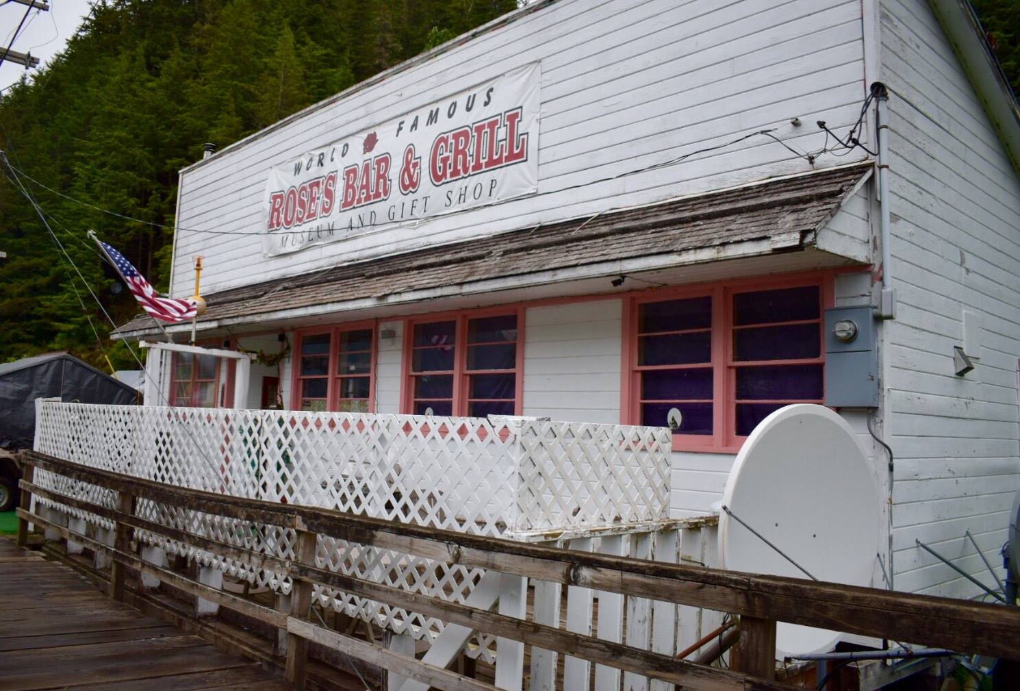 Louise Ungless Rose’s Bar PelicanDuring the last day or two I’d been relating legendary tales about Pelican’s infamous Rose’s Bar to Louise and Sarah. For many years Rose had plied her trade with her wild drinking palace being a unique haven for roughneck-breed fishermen calling into Pelican to offload their catches of deep sea pacific salmon. The long-liners and the seine netters came to the cannery that years ago had been the original reason for the settlements existence. Sadly the cannery closed in 2012 then fell into ruin, so things are much quieter these days… but Rose’s Bar still rocks most nights with wild dancing standing on the tables to live bluegrass. And occasionally, perhaps during a full moon, there’s still drunken races naked down the boardwalks at midnight but the old grey-haired grizzly bear even now sits in the warmth of the toilet pit watching you take a piss. But the days of money-flush fish-boat skippers blowing a thousand bucks on a round of drinks for everyone by ringing the big copper bell on the bar are sadly gone… there’s really no doubt that more sedate tourism will one day descend on Pelican to fill the money void.