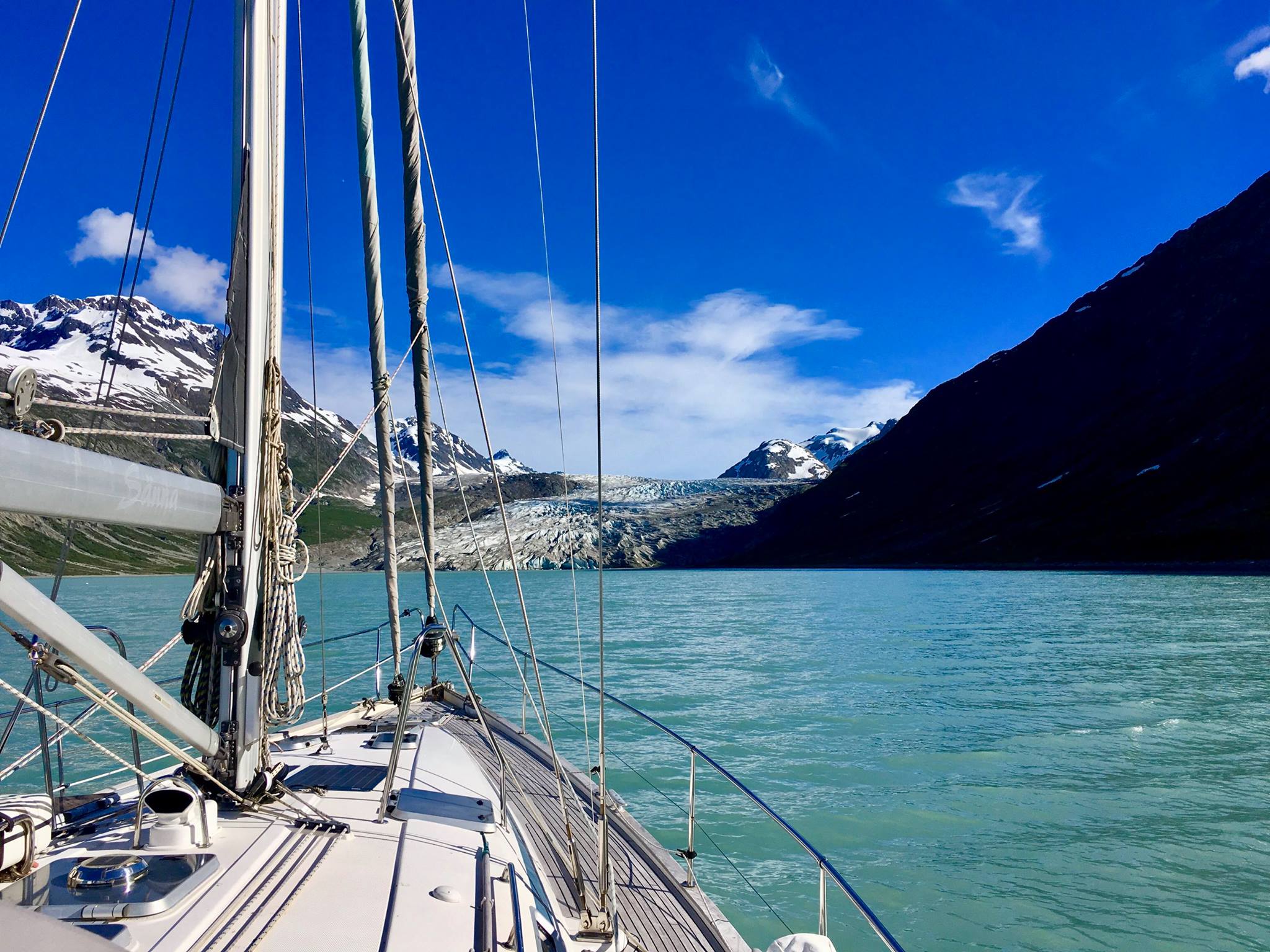 It’s a long way, nearly fifty miles from Bartlett Cove to the Reid Inlet anchorage so it took up most of the glorious day. It’s an indescribable journey, through turquoise seas coloured by dense glacial sediments dumped down by calving ice and fast-flowing glacial rivers outflows. Eventually we approached the shallow bar of Reid Inlet just before the sun dropped behind the high mountain ridges to the west of the inlet though sunset was still a good couple of hours away… we’re a long way north and the summer days are still relatively long. Chirpy was already anchored… they’d been here a few days already but it seemed they were still somewhere ashore rock climbing… as experienced mountaineers they had all the gear onboard – ice axes, climbing ropes, crampons and high-calibre belaying equipment for serious mountaineering. Morning Star should arrive sometime the next day having departed Hoonah some twenty-four hours behind us.