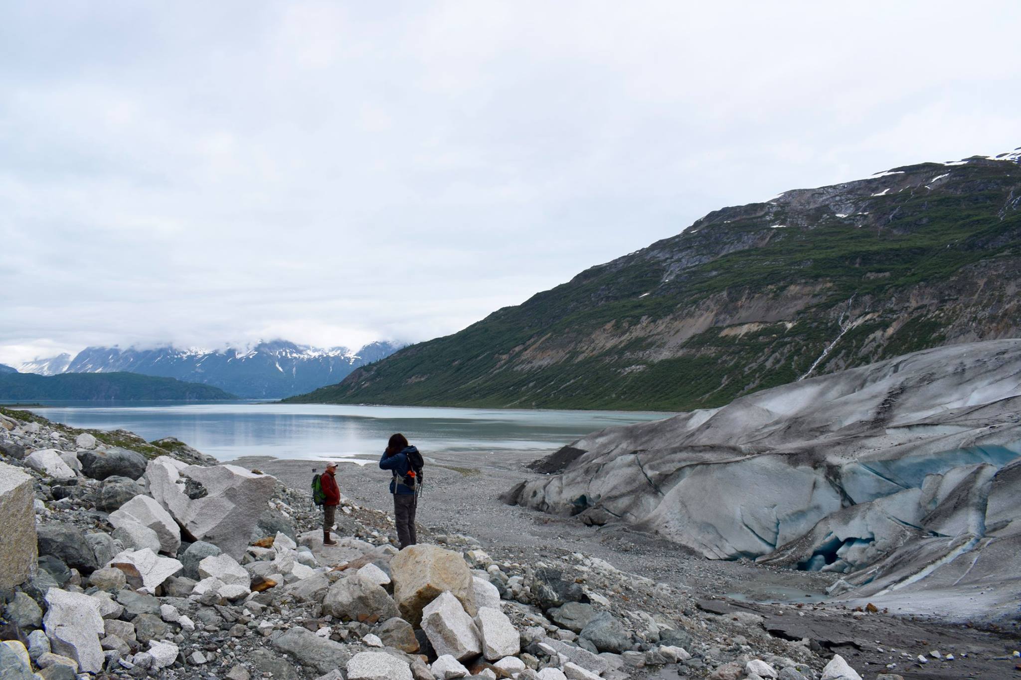 This time we got ourselves ashore safely before starting upwards beside the glacier, straightaway encountering the numerous creeks still worryingly in full glacial flow… we needed to cross each one without the benefit of convenient crossing points or any trails (this had proven overly difficult for Gary and myself when the deep snow had been too much), this time it was just as difficult even without the snow-field barrier to negotiate. Sarah and Louise were soon well ahead on account of being much younger and more athletic than myself… I was also aware this was prime grizzly bear and wolf country. I stopped every few hundred yards or so to take a look around warily, Sarah and Lou by this time were a good distance ahead trying to find a route onto the glacier.